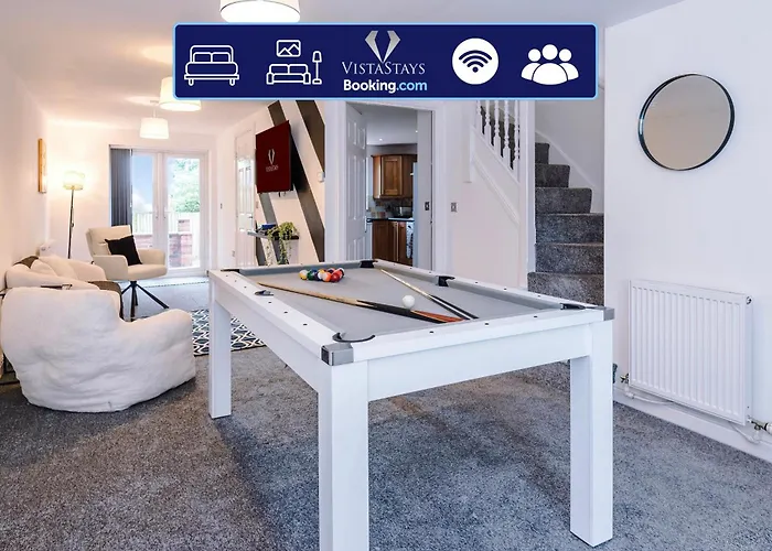 Large 5 Bedroom House with Pool Table & Parking by Vista Stays Short Lets Manchester features ironing facilities, a TV, as well as overlooks the garden. This accommodation comes with a bathroom with a tub, a separate toilet, and a shower. A hair dryer are also available.